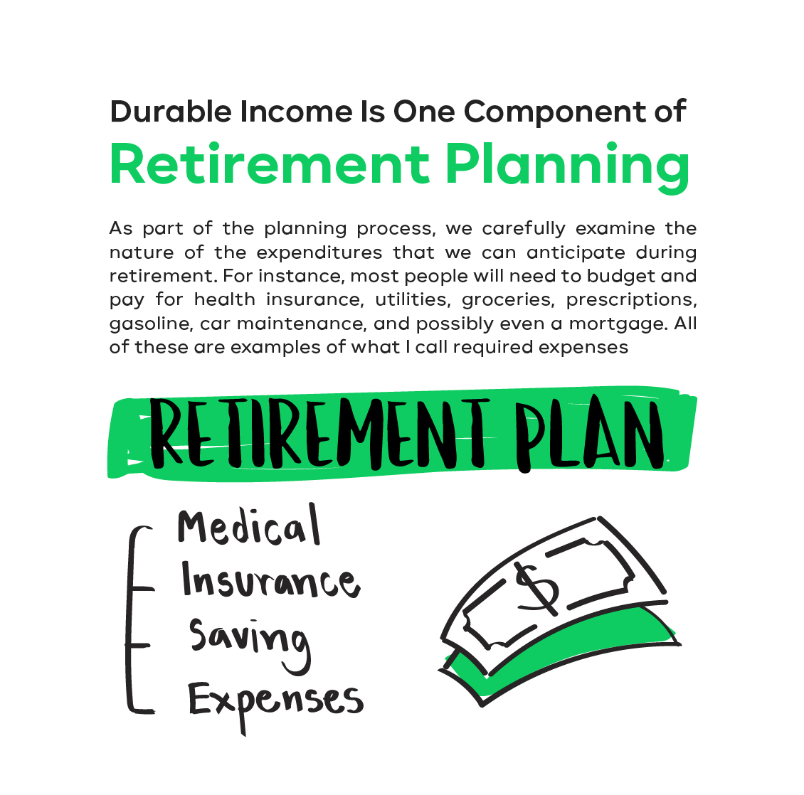 When reading about retirement income, you may see the term “durable” used. In this context, durable refers to retirement income that you can’t outlive, that the market can’t take away, and that will not erode.