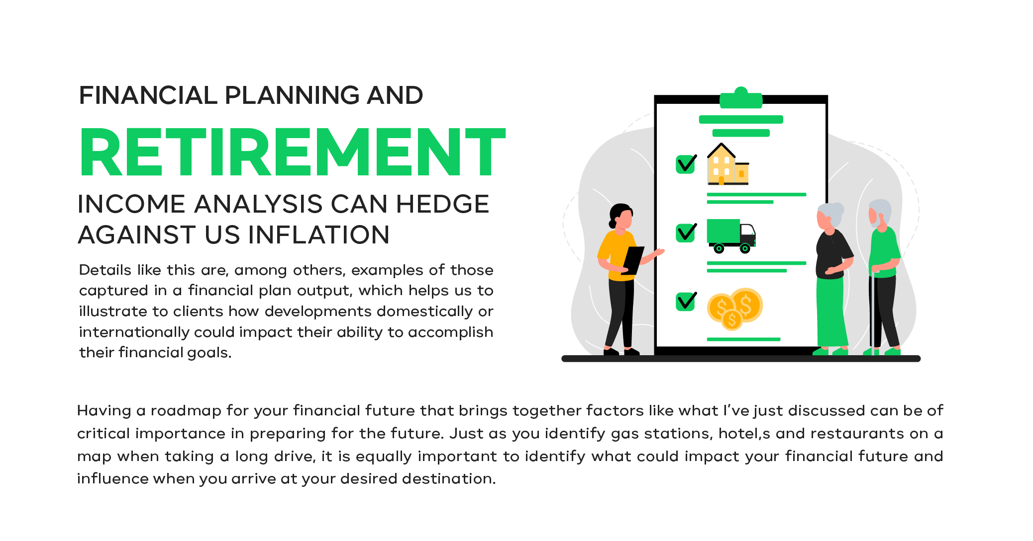 While the development of a financial roadmap will not negate these concerns, it can help by addressing the question of “What happens if?” What happens if I want to retire early? What if my retirement income is not as durable as I had thought because of rising inflation? What if Congress passes legislation that turns my estate plan on its ear & forces it to be rewritten entirely? Having a plan in hand will bring with it greater clarity about what developments the future could hold, as well as what our response to such developments would be. It is also a cornerstone in ensuring your financial stability. Retirement planning is obviously hugely important for anyone looking to maintain financial stability and sustain their retirement income.