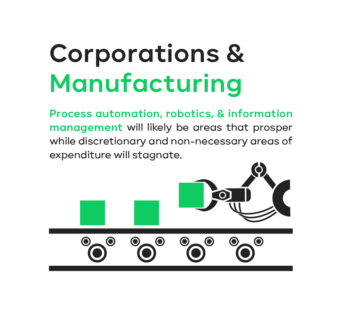 Likewise, as regulatory impediments influence capital expenditures at the corporate level, along with the additional burdens of taxation, we can expect the behavior of corporations to shift as well. At a high level, companies will become increasingly less likely to focus on the expansion of plant and capacity, and the ability to produce greater amounts of products, but will rather be incentivized to spend money in ways that increase the utility and the efficiency of the capacity that they already have. Therefore,  process automation, robotics, and information management will likely be areas that prosper while discretionary and non-necessary areas of expenditure will stagnate.