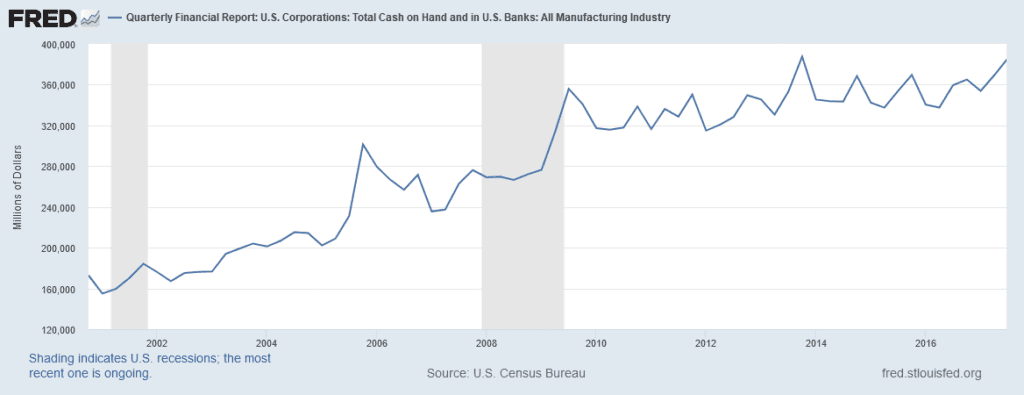 Well, if you’re not spending cash, then you’re likely hoarding it, and this has been well documented over the last ten years.  Consider this graphic from the Federal Reserve Bank of St. Louis that depicts the significant rise of cash on hand across US industrial companies over the eight years of the previous Administration, relative to the years of the Bush Administration.