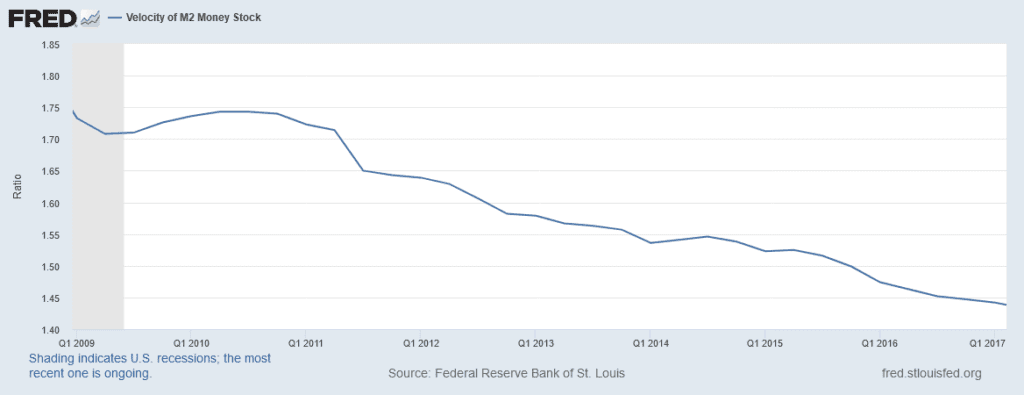 Indeed, if you’ll Google “velocity of money”, you’ll find a definition from Investopedia that describes a low velocity as being a characteristic of slow economic growth, or recessions.