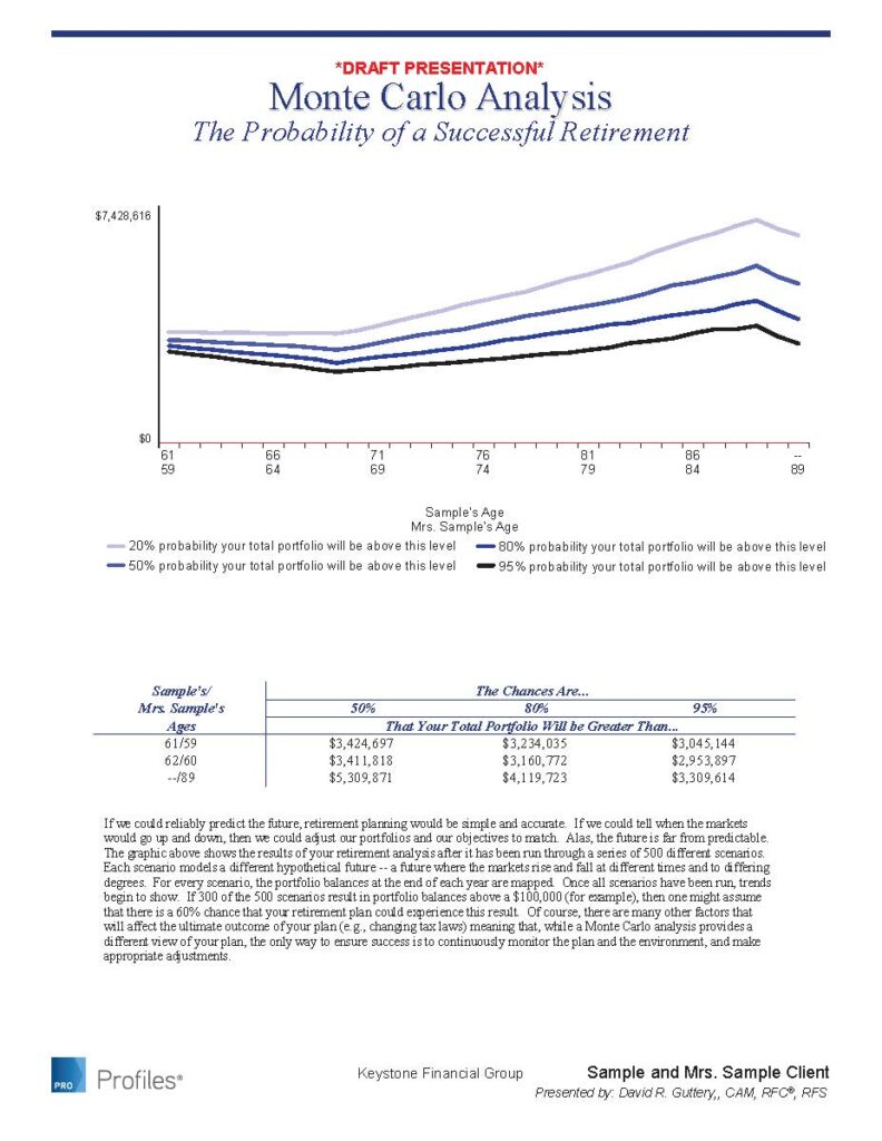 To describe it succinctly, the Monte Carlo analysis is a test. The plan details and assumptions are checked against 1,000 different market scenarios, ranging from a boom of +30% or a bust of       -38%, to assess the chance of that plan’s success as you get older, as displayed over four “confidence intervals” on a line graph. When creating the plan, the Monte Carlo simulation is the first reality check on the plan details – the retirement income plan may be to distribute $10,000/month during retirement, but if that causes all four confidence intervals to plow into the red line, then we’ll need to alter the plan’s assumptions to avoid depleting cash reserves midway through retirement. Over time, we can go back to the plan and make updates on an as-needed basis, and the Monte Carlo analysis will then update to reflect any changes that we make.